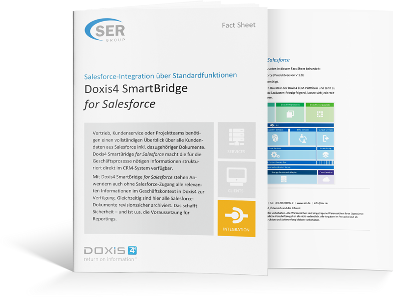 Die Doxis SmartBridge ist der spezielle Doxis Konnektor für Salesforce. Sie integrieren damit beide Systeme nahtlos – die Voraussetzung für umfassendes Informationsmanagement über Systemgrenzen hinweg.