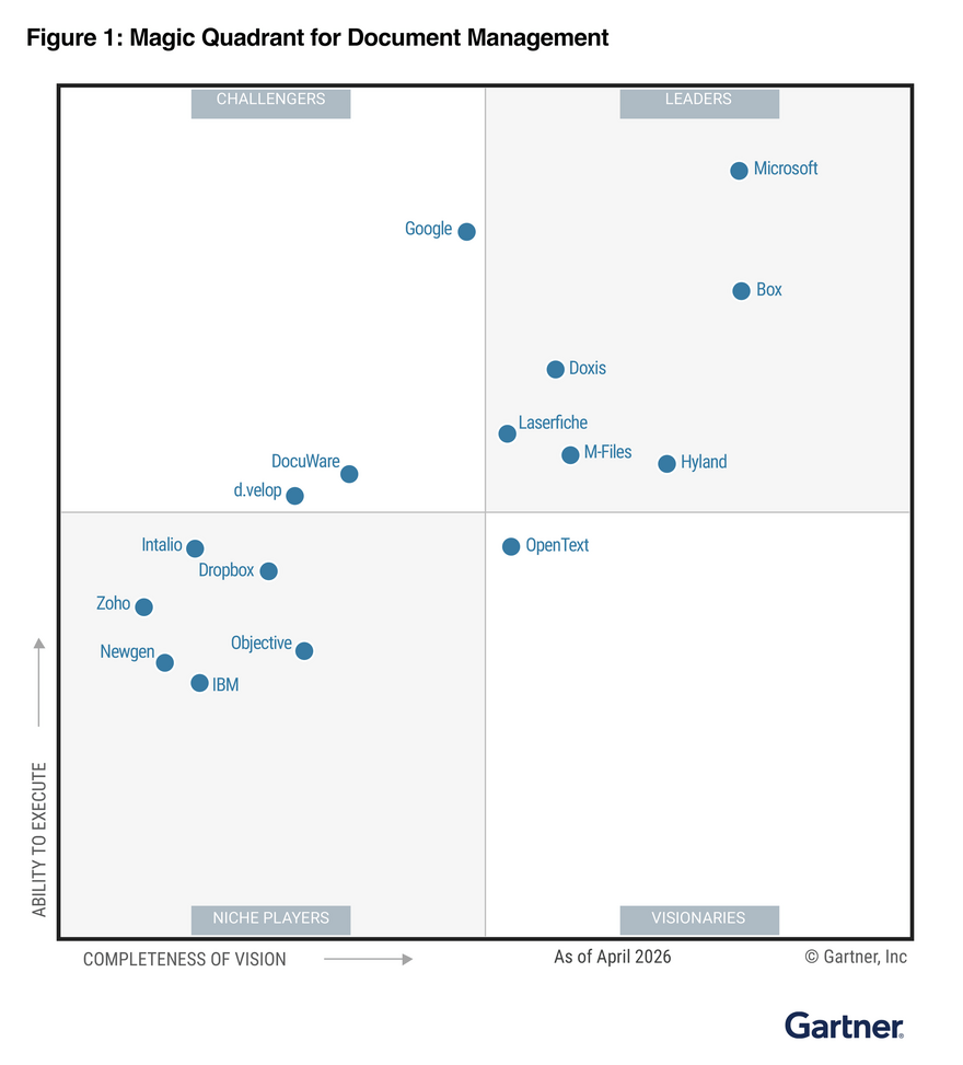 Gartner published a new Magic Quadrant™ for Document Management in 2024, replacing the previous ones for Enterprise Content Management and Content Services platforms. This 2026 edition was published in April 2026.