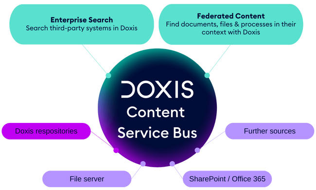 Databases, servers, ERP and CRM platforms, Microsoft SharePoint, file directories… Your company stores valuable information in numerous places — mostly isolated and difficult to locate. The result: Delays to critical business processes and an impaired ability to provide information. Content federation services from Doxis link together all your information systems. You manage documents and data consistently and in the right context, creating a central point of access to information for users, regardless of the storage location. With Doxis, you bring information back from obscurity and make business processes run seamlessly.