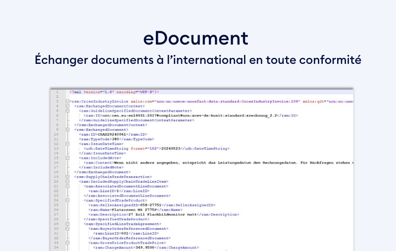 Un e-document est un document électronique enregistré dans un format lisible par ordinateur. Il s’agit généralement de fichiers JSON ou XML. Contrairement aux fichiers PDF classiques, ces formats ne sont pas conçus pour être créés, traités ou modifiés manuellement par un utilisateur. Ce sont les systèmes informatiques qui lisent, traitent et archivent ces documents électroniques, sans aucune intervention humaine.