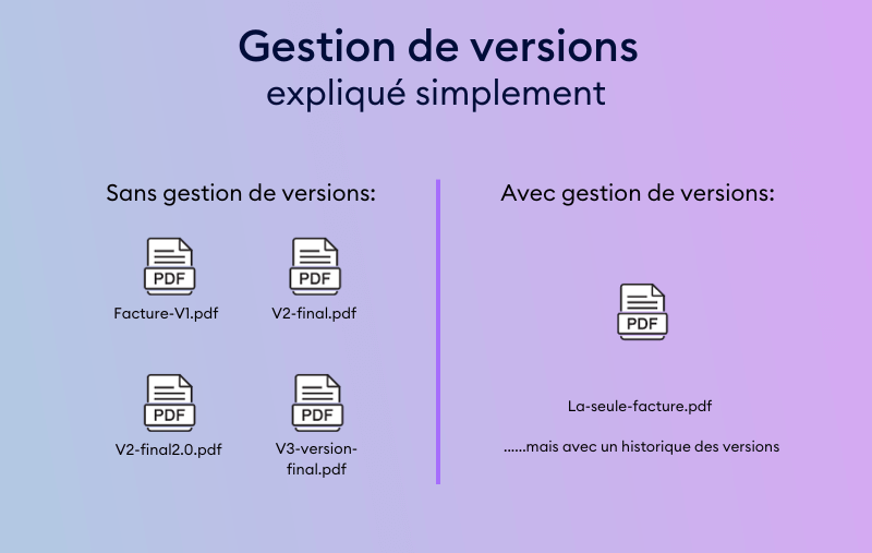La gestion de versions, également appelée versionnage ou encore contrôle de versions (VCS), désigne par définition un logiciel qui enregistre les différentes modifications apportées à un document. Il existe donc différentes versions d‘un même document. Elles sont créées lorsqu‘un salarié édite le document en question, par exemple en lui ajoutant du contenu ou en lui apposant le tampon « Approuvé ».