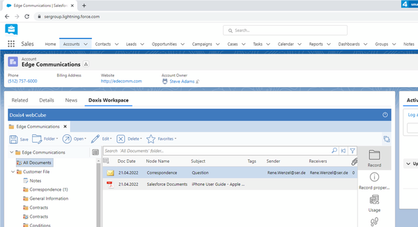 Doxis SmartBridge for Salesforce crée automatiquement un nouvel espace de travail client et le lie au compte. L’espace de travail client est intégré de manière transparente dans l’interface utilisateur de Salesforce. Steve peut y accéder directement et ajouter des documents, si nécessaire.