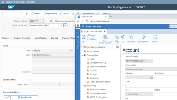 Lorsque Dexter ajoute un nouveau client en tant que partenaire commercial, l’espace de travail client Doxis correspondant est automatiquement lié dans SAP. Dexter peut désormais accéder à toutes les informations et à tous les documents relatifs à la tâche en question, et directement à partir de la vue de ce partenaire pour la facturation.